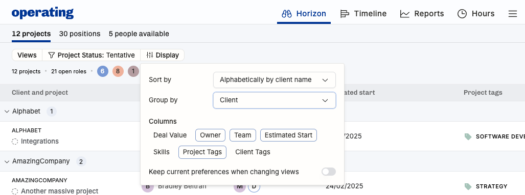 If you have a particular set of columns, sorting and grouping options you always prefer, hit the toggle to "keep current preferences when changing views".