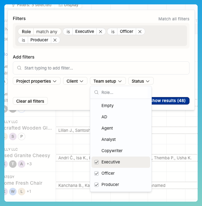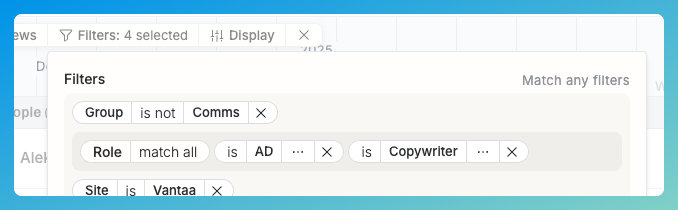 If you add multiple values that could match, like the “Role: AD or Copywriter”, you can choose to “match any” (like above) or click that pill again to match all. If you match all with two roles selected, the results will include only the people who have both the AD and Copywriter role.