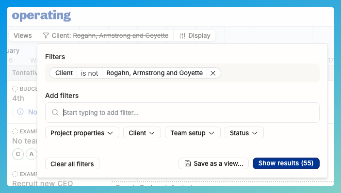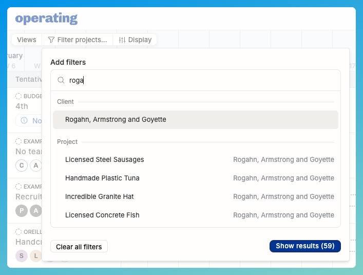 Typing with the beginning of the client name reveals that you can filter with everything related to Rogahn as well as pick individual projects.