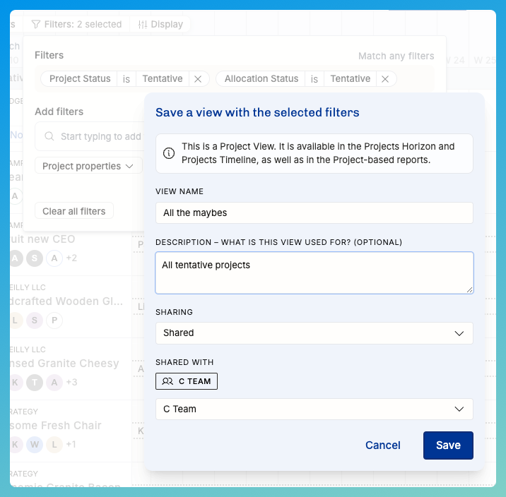This View will be useful for all the people in our C team, so I’m going to share it with them. Now, everyone in that Group will find it from their Project Views menu.