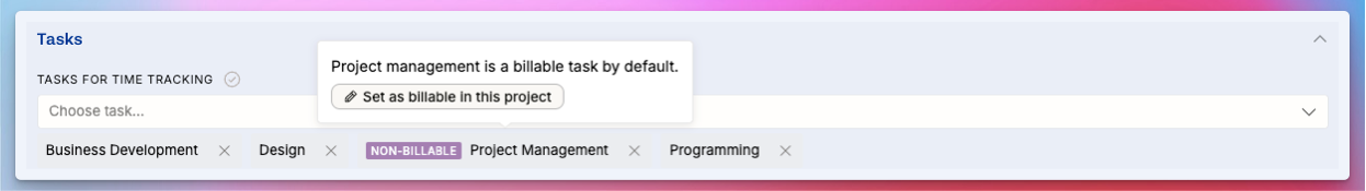 • Tasks can be marked as billable or non-billable, per project.
