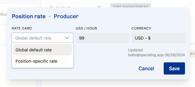 You can always override the rate per position in the team. Do this from the position editing window on the Timeline or in the Horizon, when you’re looking at the team setup. Click on the rate and choose “Position-specific rate” instead.