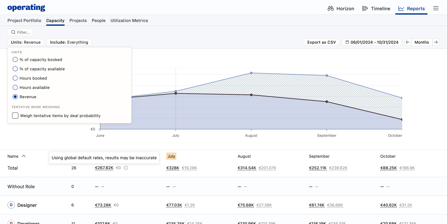 You can show most reports in either utilization-%, hours, or revenue. The global defaults may cause inaccuracies in the reporting, but at least it’s better than showing “not available” until all rates have been carefully set.