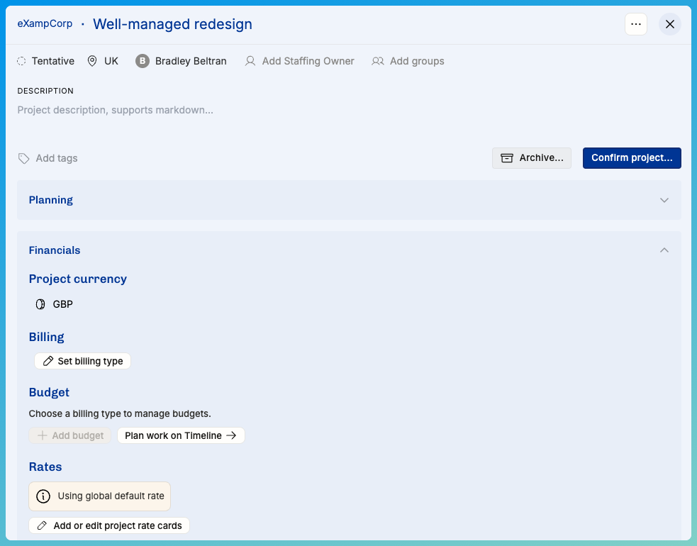 Please set the currency correctly as soon as you know it – the project rate card has to use the same currency, and all position-specific rates will also use it.