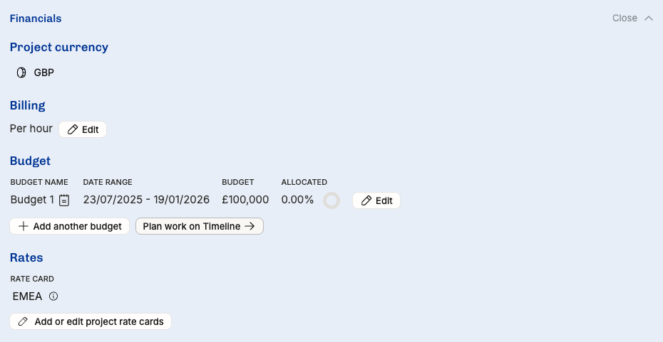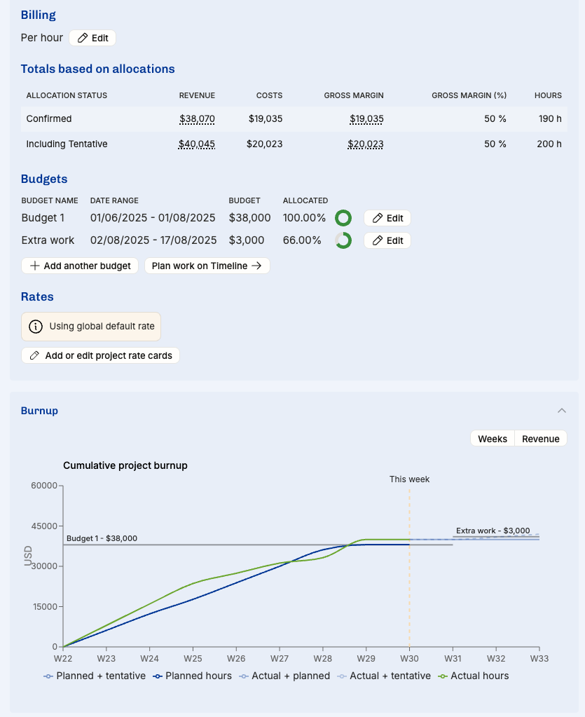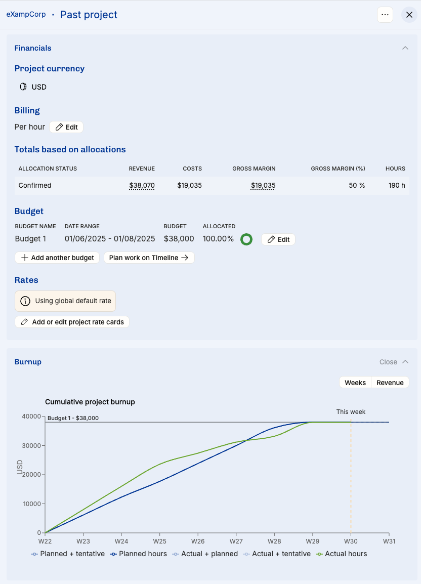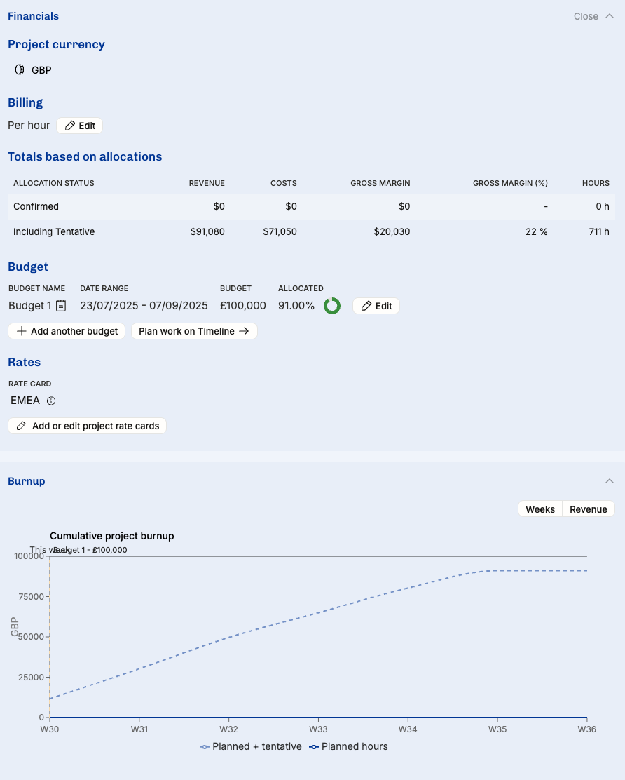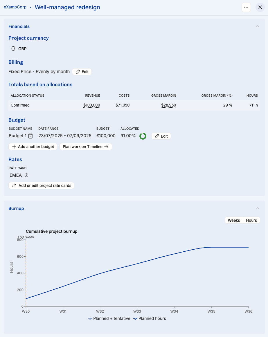 With 91% of the budget allocated, the dashed line never reaches the budget line. In the image above you can also see how the Financials section now has a summary about the revenue, costs, gross margin, and hours.