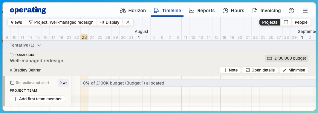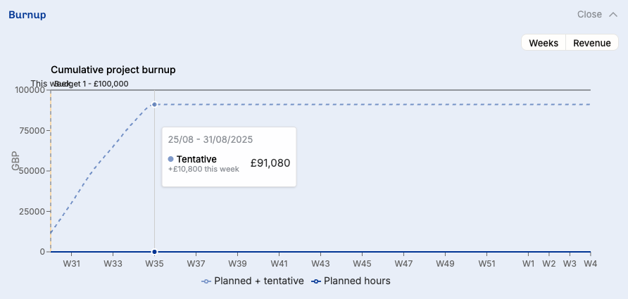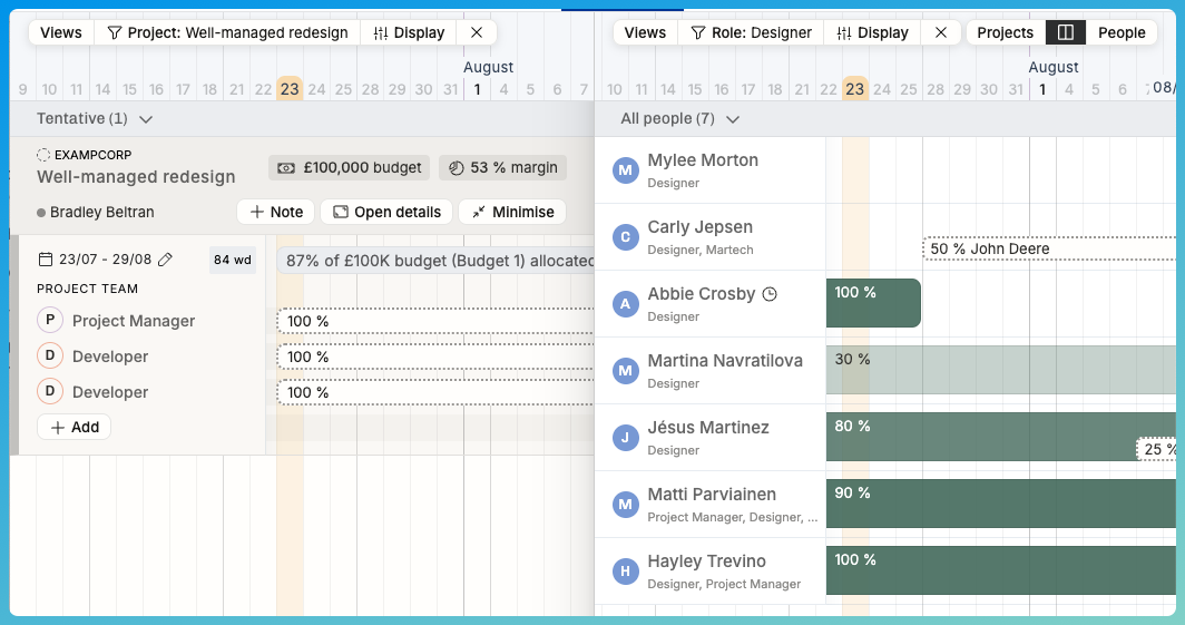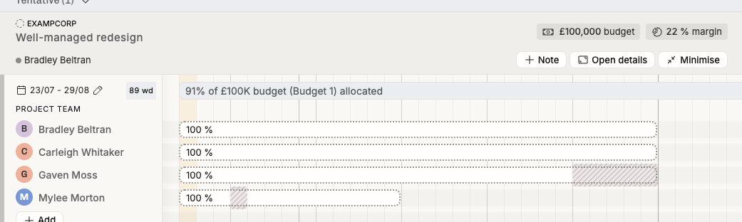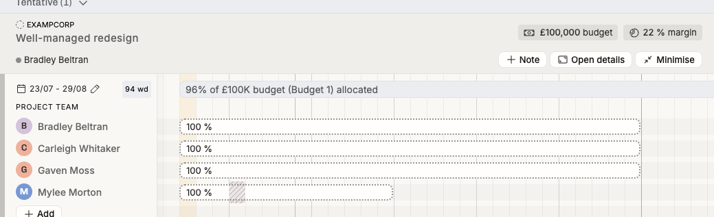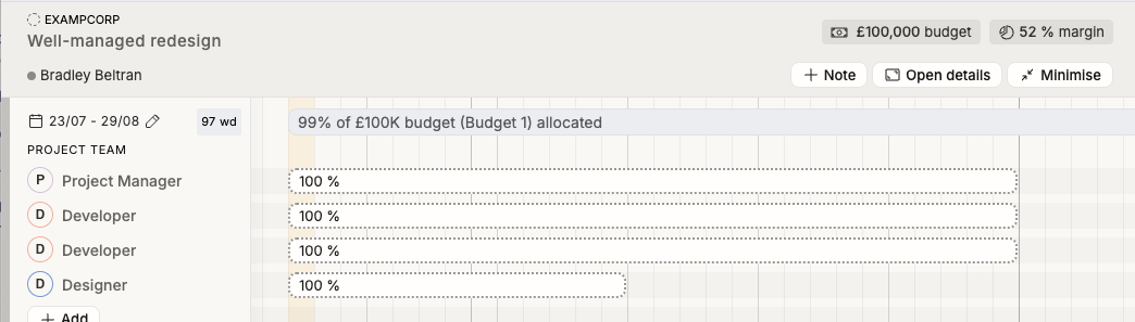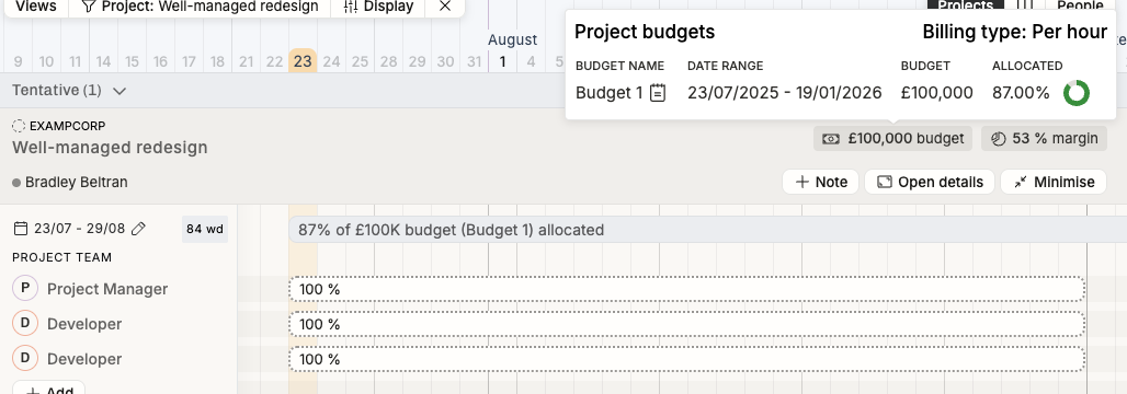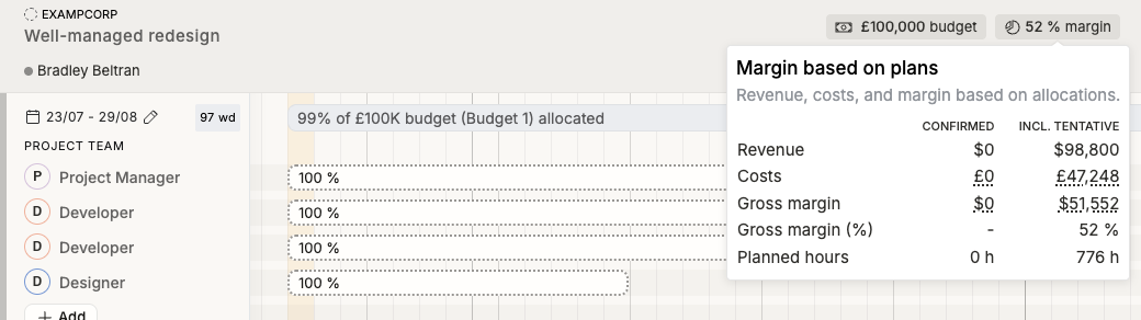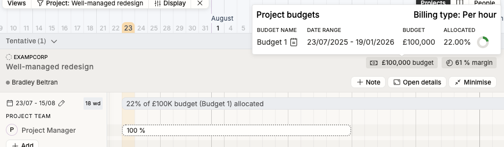 Hovering over the budget shows us how much we’ve allocated. The project manager role for 18 days amounts to 22% of the 100k budget.