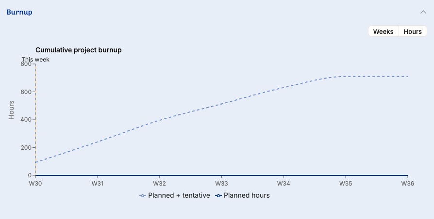 The project details contains a Burnup section that visualises the burn rate – money over time. It’s spread until week 4 of the next year because our budget is valid until then. However, as we planned the project to be much shorter with a four-person team, let’s adjust the budget dates and see a more balanced burnup chart: