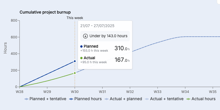 When comparing the green line to the solid blue, keep in mind that some time entries may still be missing, if the team members don’t track at the end of each day.