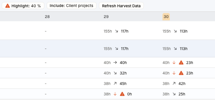 In the image above, we can identify a handful of issues with time tracking actuals: Mylee hasn’t tracked anything on week 29, and both Bradley and Carleigh have done much fewer hours on week 30 than planned. These things can be easily spotted with the Highlight tool, setting it to under/over 40% highlighting looks like this: