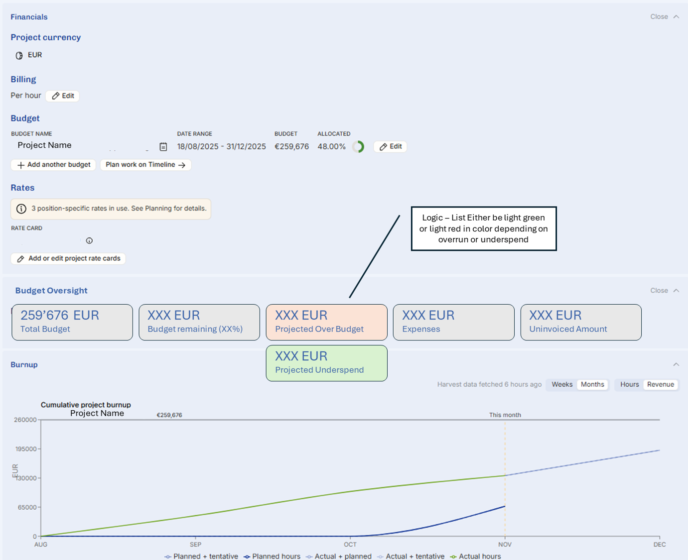 • Ability to see the projected over or underspend (Amount and %) - color coding if under / over spend ideal